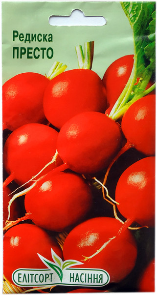 Насіння ранньої редиски Престо - високотоварний тетраплоїдний сорт для відкритого та закритого ґрунту. Придатний для зимового вирощування у плівкових та скляних теплицях. Від сходів до технічної стиглості – 18-32 дні. Стійкий до високих температур та стрілкування. Коренеплід округлий, має гарний смак, хрумкий, не трухлявіє, тривалий час зберігає товарний вигляд. Культура холодостійка. Вимоглива до вологи та легких родючих ґрунтів. Насіння проростає при температурі 2-4°C. Оптимальною температурою формування коренеплодів є температура 15-18 °C. Висів насіння на глибину 2-3 см. Норма висіву 1,5-2 г/м2.