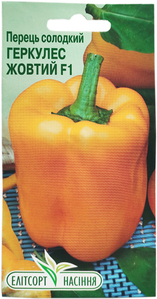 Насіння солодкого перцю Геркулес жовтий F1 - середньоранній гібрид. Період від сходу до технічної стиглості 115-120 днів. Рослина компактна, висотою 75-80 см. Плоди кубовидної форми, масою 250-300 г. Товщина стінок плода - 1 см. У біологічній стиглості жовто-оранжевого кольору. Культура тепло та вологолюбне. Розміщувати краще на сонячних ділянках, захищених від вітру. Вирощувати розсадним способом, найкращий вік розсади – 55-65 днів. Не рекомендується вносити свіжий гній - це знижує врожай плодів та їхню якість. Висівати насіння на глибину 2 см.
