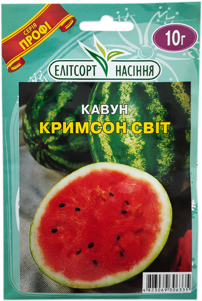 Насіння кавуна Кримсон Світ - середньоранній сорт. Плоди округлої форми масою 8-10 кг. М'якуш ніжний, яскраво-червоний, без прожилок, дуже солодкий. Високі смакові та товарні якості. Висока транспортабельність. Дає високий урожай за умов посухи. Стійкий до хвороб. Культура теплолюбна, надзвичайно вимоглива до світла. Вимагає легких родючих ґрунтів. Висівати насіння на глибину 3-5 см. Норма висіву – 0,2-0,3 г/м2. При оптимальній температурі проростання (20-25°С) сходи з'являються через 5-6 днів після посіву.